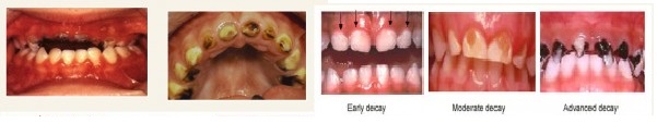 Early childhood caries, also known as nursing bottle caries, is a very common bacterial infection characterised by cavities that most often show up on a child’s upper front teeth but can also affect other teeth. It first shows up as white spots near the gum line. These spots are hard to see at first, but if caught early can be stopped from progressing into cavities. As it gets worse, they can look like brown spots, holes or broken teeth which will require more involved procedures to fix. It is very important to get treatment early to stop the decay from getting worse.